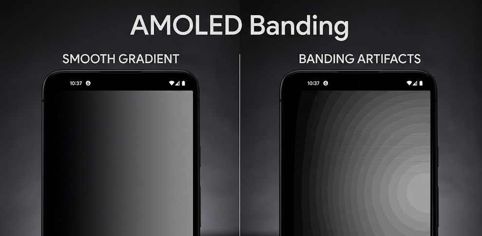 AMOLED banding refers to visible vertical or horizontal stripes that appear most clearly in low-gray backgrounds or uniform dark scenes. It is a luminance non-uniformity phenomenon, typically observed between 1%–20% grayscale levels.
